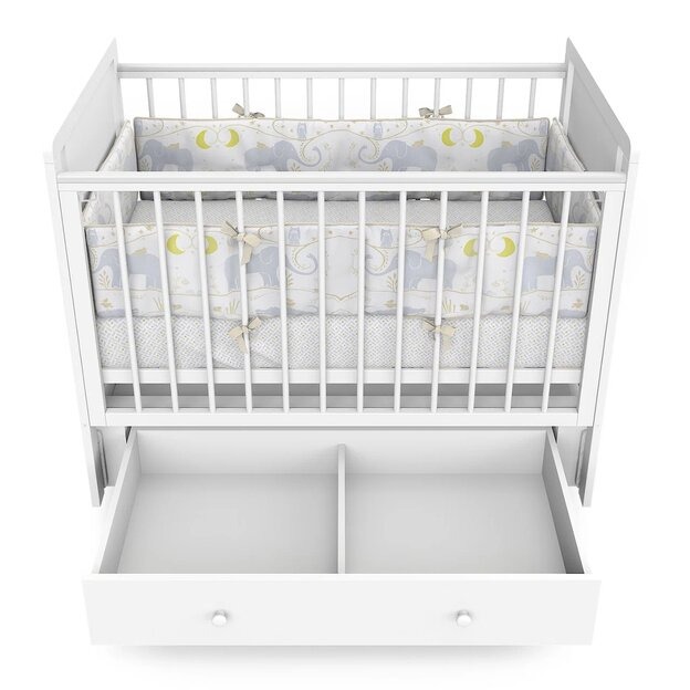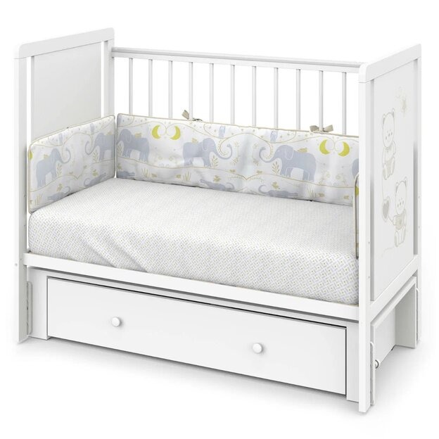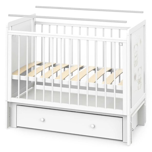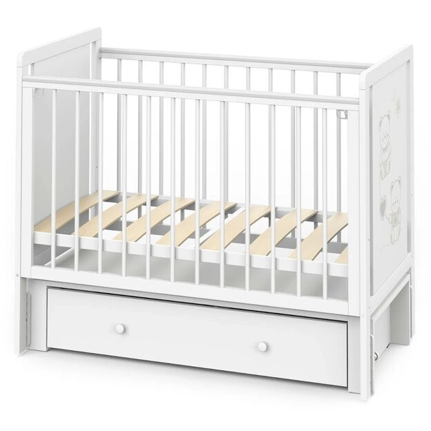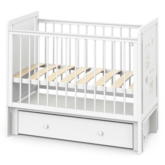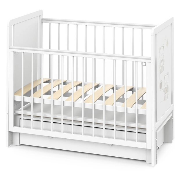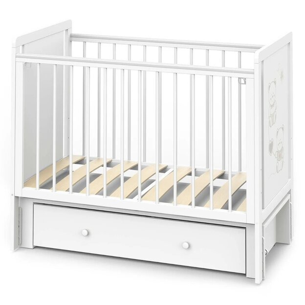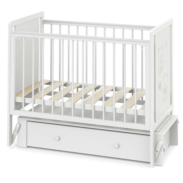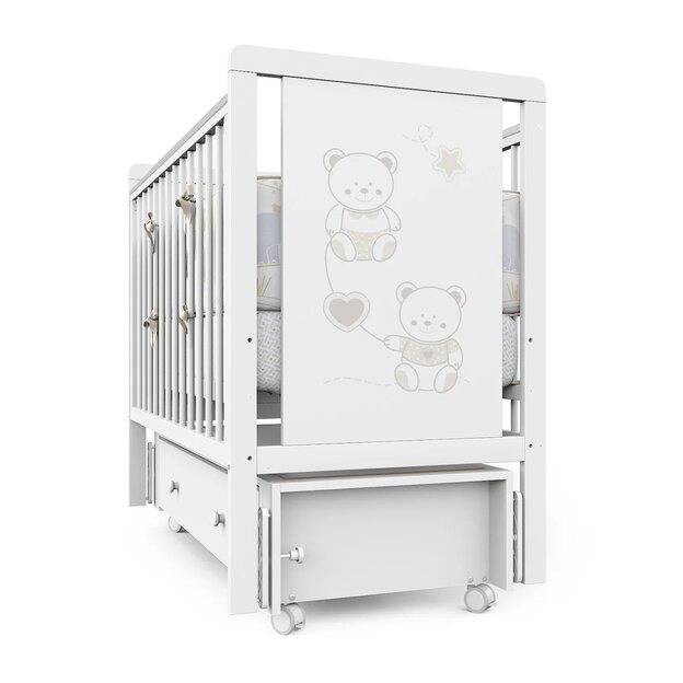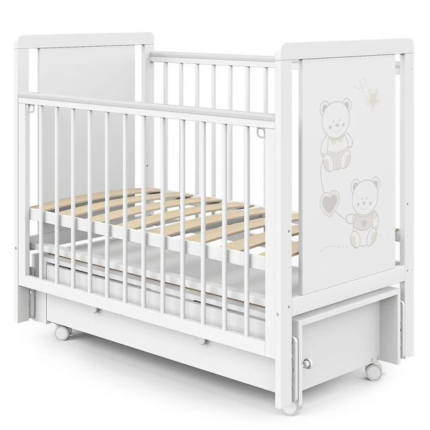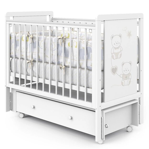 Кроватка детская Indigo "Happy Friends" (маятник + колёса, ящик), белая аляска/мишки
