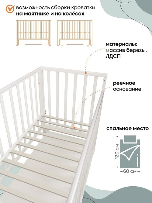 • Силиконовые колеса с плавным ходом: позволяют легко перемещать кроватку по комнате.