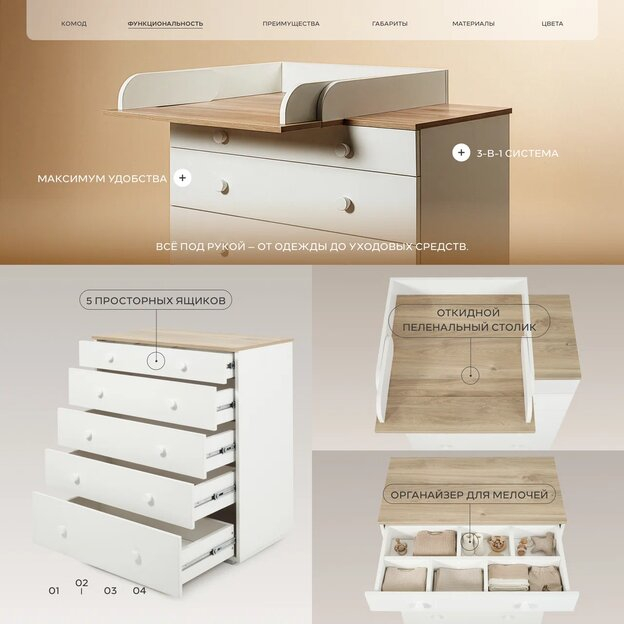 • 5 вместительных выдвижных ящиков бесшумны - они не потревожат спящего кроху