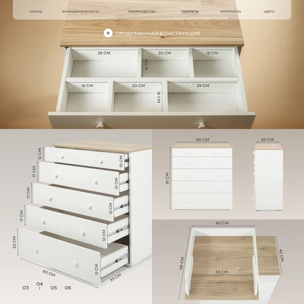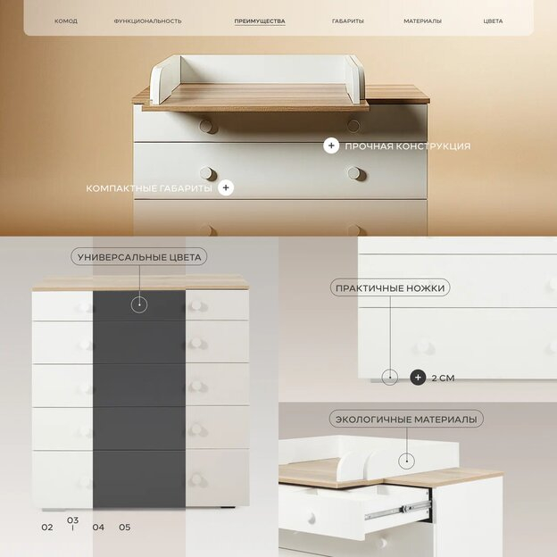 • практичные низкие ножки высотой 2 см предотвращают скопление пыли под комодом, поддерживая чистоту