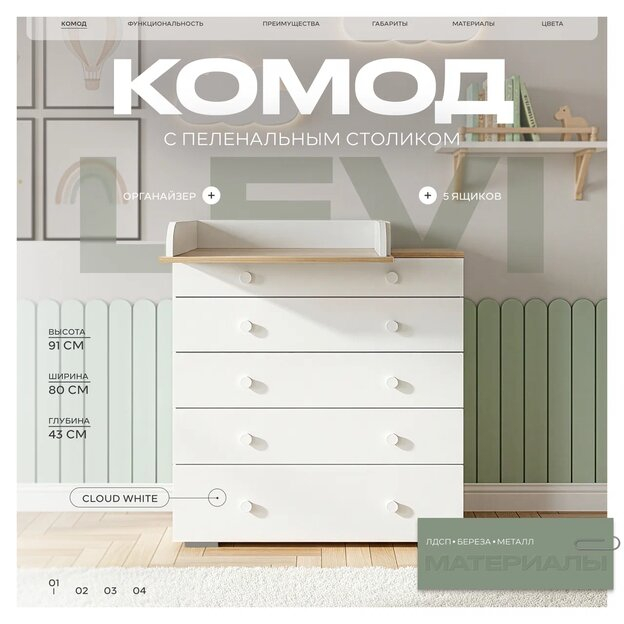 Купить Комод пеленальный Rant Levi 80/5 с органайзером (арт.128) цвет: Cloud White можно в интернет-магазине Мир колясок Брянск, для этого необходимо поместить товар в корзину и оформить заказ. Подробное описание, характеристики, отзывы, фотографии. Все вопросы и пожелания просьба указывать в комментариях к заказу.