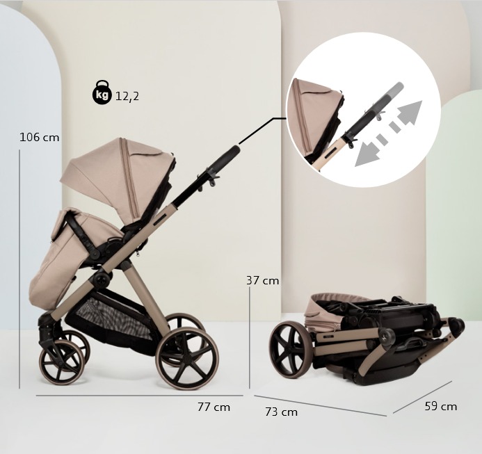 - Плюс телескопическая ручка уменьшает размеры коляски в сложенном виде. Когда вы складываете Sigma, ручка автоматически втягивается, и коляска занимает меньше места в багажнике или прихожей.