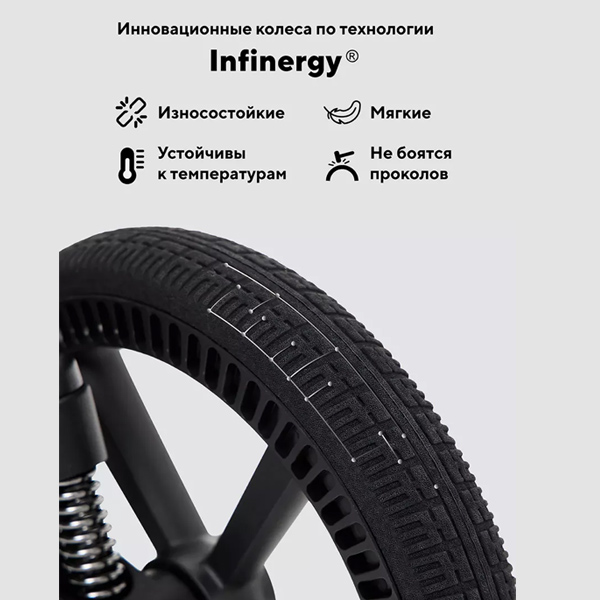 - материал колес, выполненный по технологии Infinergy®. Это новейшая разработка, представляющая собой вспененный термополиуретан (E-TPU). Новый материал колес характеризуется: легкостью - коляска стала весить еще меньше; невероятными амортизирующими свойствами - ход еще мягче, поглощение ударов еще эффективнее; максимальной долговечностью - E-TPU проколоустойчив, а также отличается высокой стойкостью к деформации, поэтому моментально самовосстанавливается даже после сложного ландшафта; устойчивостью к любым погодным условиям - материал не потеряет свои свойства при любой температуре.