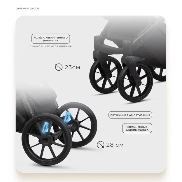 • система антишок (SAS - shock absorption system) - специальная амортизация, которая устанавливается на передние колеса. SAS превращает неровности и дефекты дороги в ровное полотно - ребенок полностью защищен от ударов и резких толчков при наезде на препятствие. Также при попадании колеса в ямку не происходит подвисания - коляска спокойно продолжает путь.