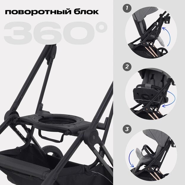 • инновационный поворотный блок, вращающийся на 360°, позволит в одно движение поменять направление: поднимите подножку и поверните сиденье до щелчка