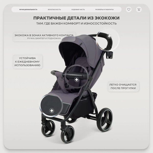 • ручка коляски и бампер отделаны практичной и эффектной перфорированной экокожей. Кроме того, и ручка, и бампер дополнены мягким наполнителем - вам и малышу будет невероятно комфортно