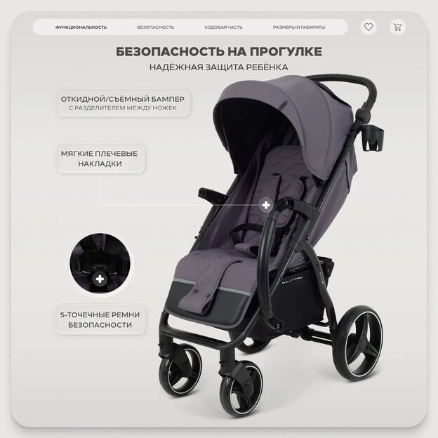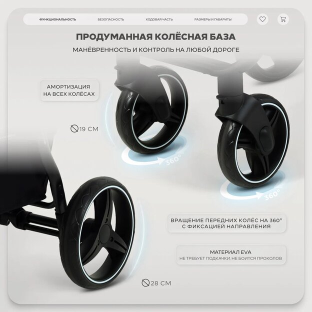 • пружинная амортизация на передних колесах - малыш не почувствует даже серьезных препятствий на дороге